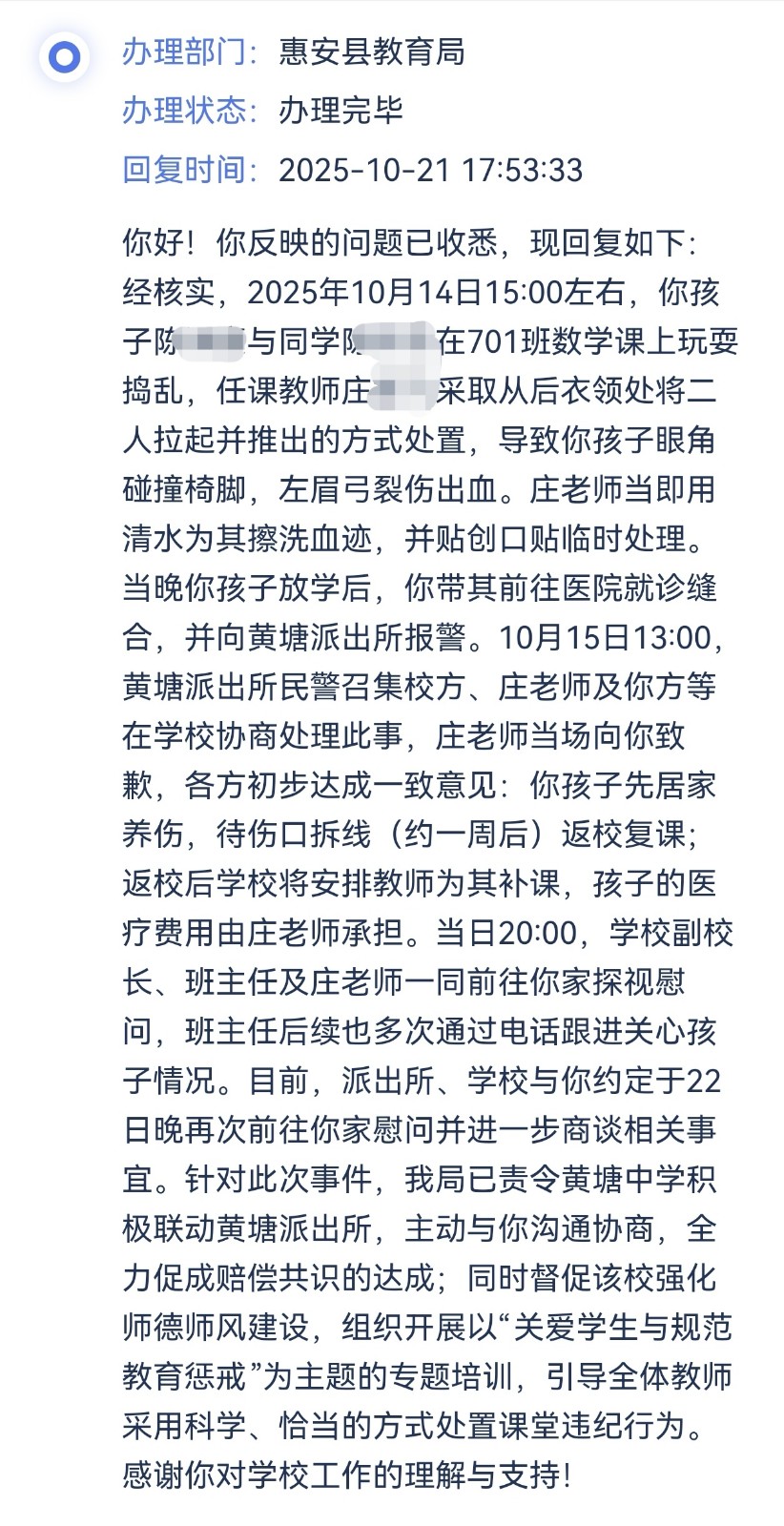 海报新闻记者赵恩报道:“缝了6针,老师说是皮伤。” 10月14日下午,福建泉州的陈先生收到老师的消息,称儿子在学校摔倒,可能皮外伤。直到放学回家,他才得知儿子被老师推搡,眉毛被划伤。当晚被送往医院后,孩子缝了6针。家人联系了涉事老师,对方却表示:“小事,明天再说。” 10月27日,陈先生告诉海报新闻记者(记者微信公众号:Haibaonewssw),儿子今年13岁,刚刚升入初一,目前就读于福建省泉州市惠安市皇塘中学。 “儿子上课的时候,同桌一直捏他。儿子阻止他,但同桌不听,还继续掐他。”一直挠他痒痒。老师看到后,没有核实情况,就直接走到了椅子上。 “他拉住每个人的耳朵,然后掐住他们的脖子,试图将他推出教室。”陈先生说,老师推了他的儿子,导致儿子撞到了他的头。“我儿子摔倒在地上,他抓住他的耳朵把他从地板上拉起来,试图把他推回教室。”您认为老师的行为是否过分?”陈先生告诉记者。陈先生称,事情发生在下午3点左右,当时只是用老师的水龙头给孩子清洗伤口,贴上创可贴。直到4点41分,他才给妻子打电话说:“你儿子在教室里玩,摔倒了。”他可能有皮外伤。 “你可以带他回家,看看是否需要送医院。”因为听老师的话,陈先生以为男孩没事。直到当天晚上八点多,他才把男孩带回家。宁自修的时候,他发现伤口比他想象的还要严重。 “当时我的腿都在发抖,我赶紧把孩子送到福建医科大学附属第二医院,缝了六针。到医院的时候已经10:00了。”令陈先生家人愤怒的是,当晚家人联系老师时,却没有遇到这样的情况。通知班主任后,家人又给老师打电话,对方果然说道:“小事一桩,明天再说。” “当时我还在医院,家人很伤心,就直接去派出所报警了。”陈先生告诉记者,派出所了解情况后,老师仍声称孩子是自己摔倒的。幸好现场有监控录像,老师承认了事实。事发后,陈先生联系了惠安县教育局. 10月21日,惠安县教育局回复陈先生称:“经证实,2025年10月14日15时左右,你儿子与同学在701班数学课玩耍闹事,造成撕裂伤、流血。”回应称,10月15日,黄塘派出所民警致电学校、庄老师、陈先生与学校交涉。庄老师当场道歉,各方达成一致:男孩先回家,拆线后(一周左右)返回学校复课;返校后,学校会安排老师给他补习,孩子的医药费则由庄老师承担。辉县教育局回应称,“如果达不成协议,我们还敢说吗?”陈先生认为,沟通的结果令他不满意,儿子自此一直在家呆着。那天并不想再见到老师。 “他在派出所的时候,让他妈妈给我发微信,说他看到老师就害怕,不敢去学校,让我帮他请假。”目前,陈先生希望将儿子转到另一所学校。 “儿子在学校发生了这种事情,老师的行为非常恶劣,学校是否不负责任?黄塘派出所积极沟通协商,全力就赔偿问题达成共识;同时鼓励学校加强教师师德和行为建设,组织以“关爱学生、教育标准和惩罚”为主题的专题培训,引导全体教师用科学、恰当的方法处理课堂上的违规行为。10月27日,记者致电惠安市黄塘中学郑校长多次到访拨打了陈先生提供的联系方式,但无人接听电话。