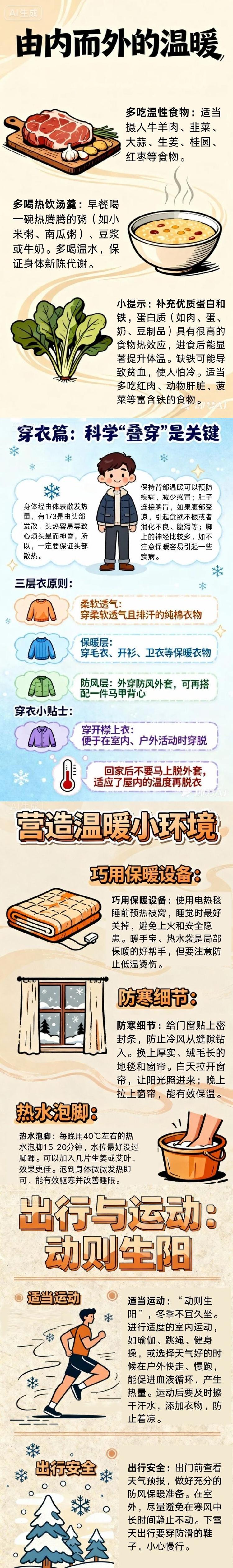 本周,新一波强冷空气将袭来。此次冷空气将从西向东影响我国大部分地区。本季节气温普遍低于正常水平,大面积地区气温将创六个月来新低。 17日下午至18日白天,受强冷风影响,山东预计将迎来今年入冬以来的首场雪。衣柜里的厚衣服都能穿!今天我就给大家带来一些保暖小窍门,让你们正式把保暖提上日程吧! (海报新闻编辑李佳整合新华网、光明网、大众日报等,图片由AI生成)