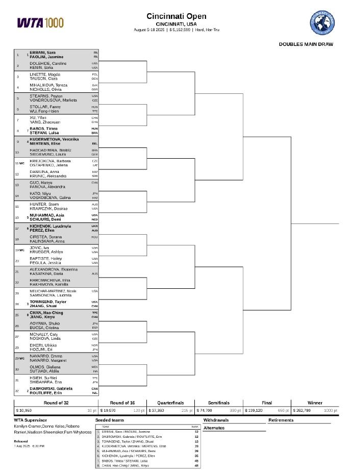 WTA1000辛辛那提双打彩票图表发布,WTA1000蒙特利尔女子双打亚军Zhang Shuai/Townsend将面对Merichal/Samsonova。对决如下:[3] Zhang Shuai/Townsend vs Merichal/Samsonova [8] Jiang Xinyi/Zhan HaoQing vs Aoyama Xiuzi/bukshaxu yifan/Yang Zhaoxuan vs [7] Babos/Stefanie