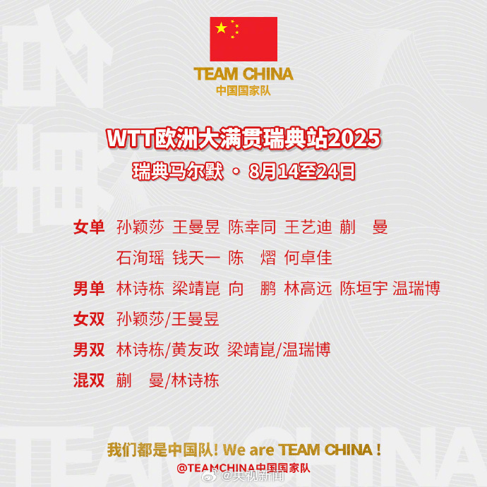 从8月14日至24日,2025年WTT欧洲大瑞典车站将在瑞典的马尔默举行。中国国家队发布了全国网球比赛的名单。 List of women's women Sun Yingsha, Wang Manyu, Chen Xingtong, Wang Yidi, Kuai Man, Shi Xunyao, Qian Tianyi, Chen Yi, He Zhuojia, Male Singles Lin Shidong, Liang Jingkun, Xiang Peng, Lin Gaoyuan, Chen Yuanyu, Wen Ruibo Dolesy Sun Shidong/Huang Youzheng, Liang Jingkun/Wen Ruibo混合双打Kuai Man/Lin Shidong