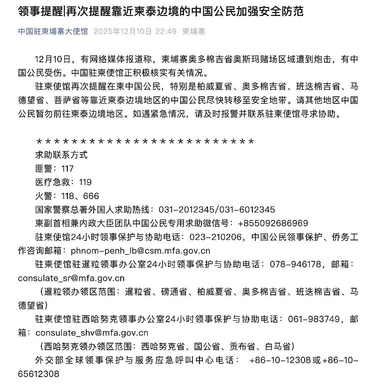 12月10日,网络媒体报道称,柬埔寨奥多棉吉省OSMA赌场场地遭到破坏,造成中国公民受伤。中国驻柬埔寨使馆正在积极核实相关情况。驻柬埔寨使馆再次提醒在柬中国公民,特别是柏威夏、奥多棉吉、班迭棉吉、马德望、菩萨等靠近柬泰边境地区的中国公民尽快转移至安全地点。建议其他地区的中国公民暂时不要前往柬泰边境地区。如遇紧急情况,请立即报警并联系驻柬埔寨使馆寻求帮助。 (人民日报客户端丨白元琪)